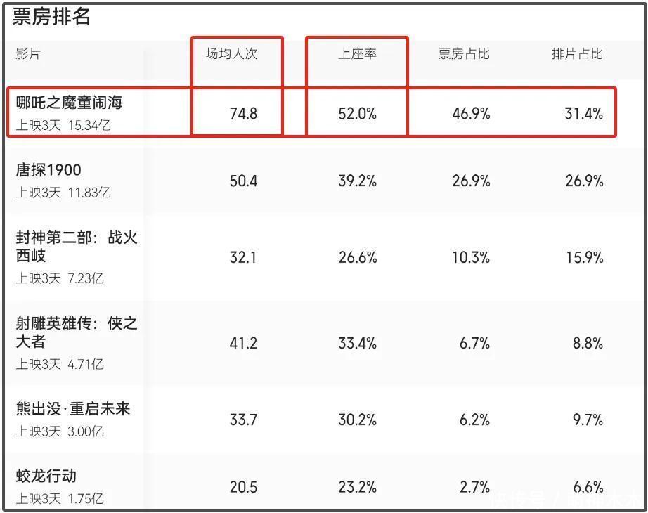 就《哪吒》最新票房施展看,整部电影照旧有吸干大盘的趋势,一直到黄金档,《哪吒》在排片占比31%的情况下,上座率高达52%,场均东说念主次更是高达74.8,这是什么成见呢?相等于一个100场至少坐了74个东说念主看《哪吒》,同期意味着《哪吒》招引了非刚需群体不雅看。