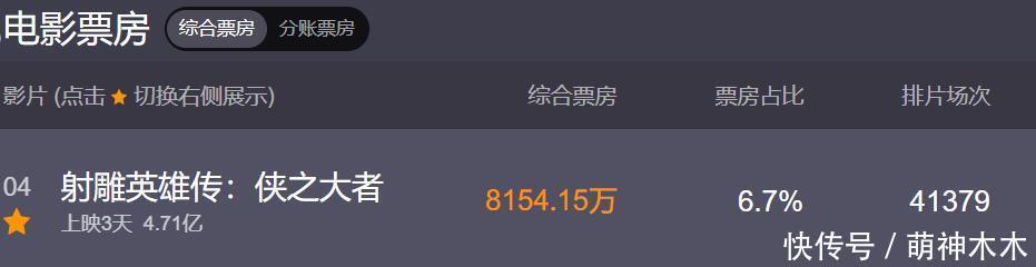——《射雕袼褙传:侠之大者》票房破4亿,其中包含3亿预售,票房走势越来越不睬思。