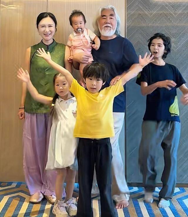 杜星霖站在一旁笑意盈盈,四个孩子围在身边,个个眉眼间都像极了张纪中。
