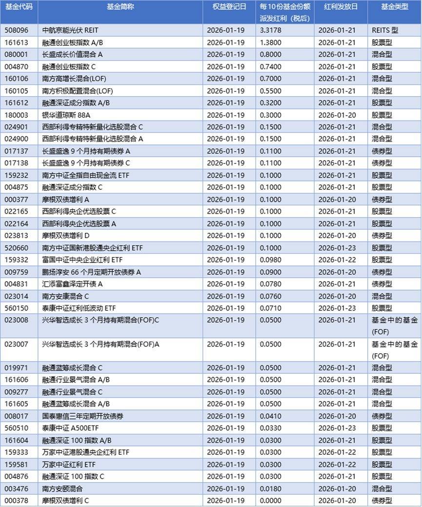 (1)01月19日新发基金共有57只,主要为基金中的基金(FOF)基金和夹杂型基金,其中天弘中证工业有色金属主题ETF召募设想金额达80.00亿元;基金分成38只,多为股票型,派发红利最多的基金是中航京能光伏封锁式基础顺序证券投资基金,每10份基金份额派发红利3.3178元。
