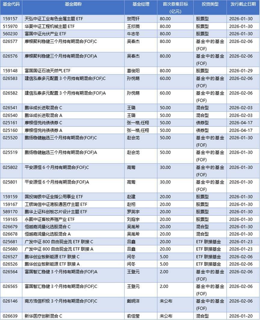 (2)新年首月,基金刊行合手续加快。数据知道,本周(1月19日至1月25日)全商场共有40只新基金运转刊行,环比增幅约11%,聚拢第三周保合手35只以上高位。其中,FOF(基金中的基金)成为最大亮点,单周新发数目达12只,刷新历史记录。岁首商场波动加重,投资者风险偏好趋于正经,具备钞票设置属性的FOF居品需求升温;同期,基金公司亦借新发潮完善居品线,为全年规模战提前蓄力。瞻望跟着春季行情周边,职权与固收类新品仍将保合手较快刊行节拍。