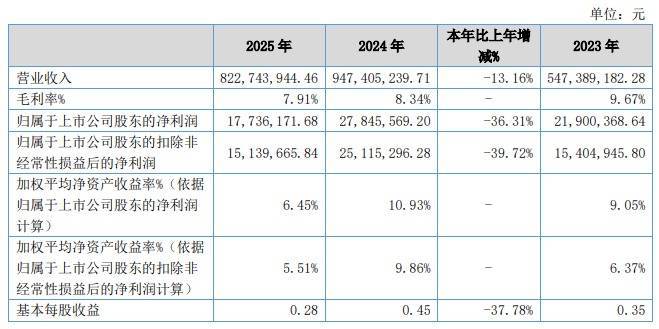 日前,北交所上市公司新威凌(920634)公布2025年年报,公司买卖收入为8.23亿元,同比着落13.16%;归母净利润为1,773.62万元,同比着落36.31%;扣非归母净利润为1,513.97万元欧洲杯app,同比着落39.72%;接头现款流净额为-651万元,同比着落139.5%。